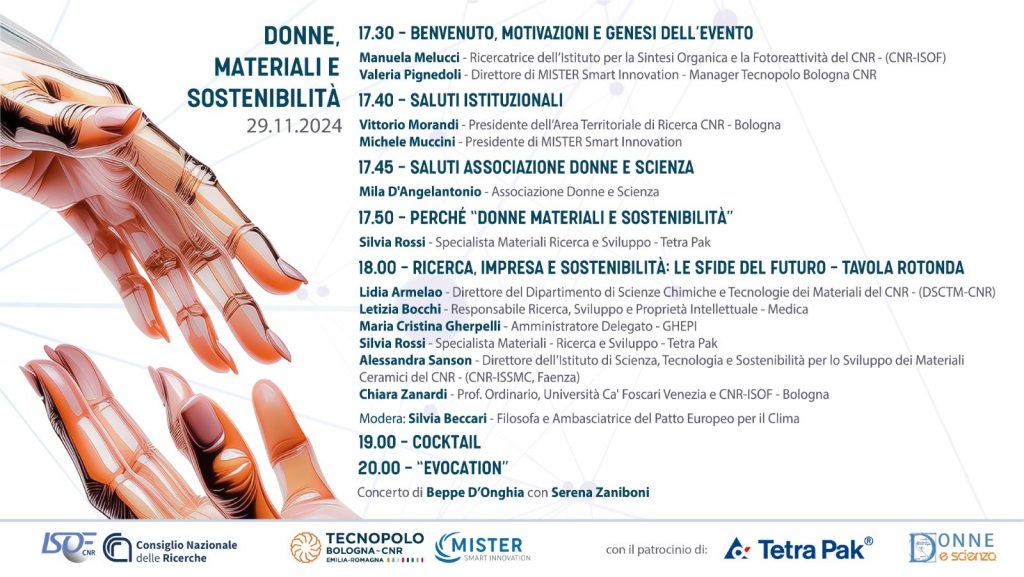 • Il 29 novembre Mila D’Angelantonio ha portato il saluto della nostra presidente Sveva Avveduto e dell’Associazione all’evento: “Donne, Materiali e Sostenibilità”, che si è tenuto nella Biblioteca Dario Nobili, Area Territoriale di Ricerca del Consiglio Nazionale delle Ricerche (CNR) di Bologna, via Piero Gobetti 101. L’evento ha rappresentato un’opportunità di dialogo tra ricerca e imprese su materiali e sostenibilità, con un focus speciale sul ruolo delle donne. Il cuore dell’incontro sarà la condivisione di esperienze e lo scambio professionale, per evidenziare l’impatto positivo di soluzioni innovative nei settori produttivi e nella società. E’ organizzato da un gruppo di donne guidato dalla nostra socia Manuela Melucci (da fine 2025 Direttrice dell’Istituto ISOF).