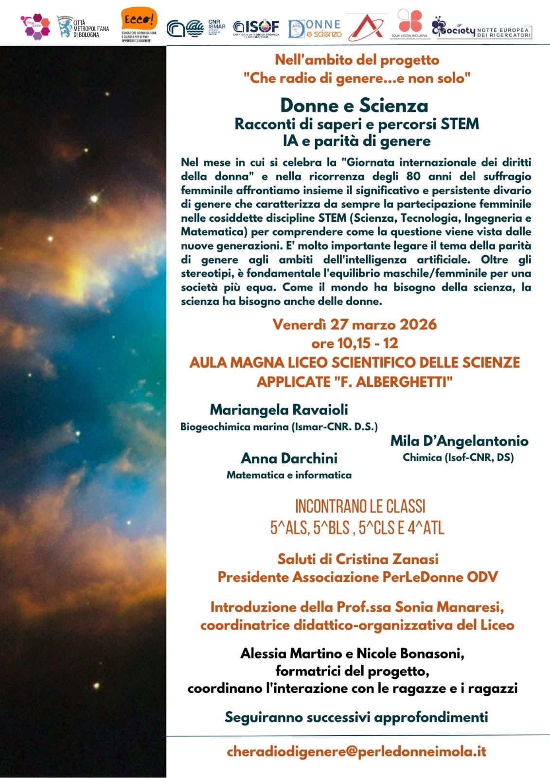 Donne e Scienza: Racconti di saperi e percorsi STEM: M. Ravaioli e M. D’Angelantonio incontrano studentesse e studenti insieme alla dr.ssa Anna Darchini che parlerà di IA e Parità di genere